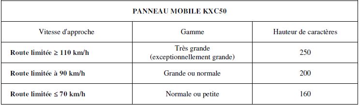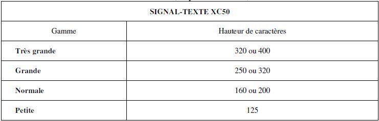 Pour la lisibilité des panneaux à messages variables, des hauteurs minimales de caractères L11 ou L12 doivent être respectées. La hauteur des caractères affichés sur un même panneau XC50 ou KXC50 est constante. Ces hauteurs minimales, exprimées en mm, sont les suivantes :