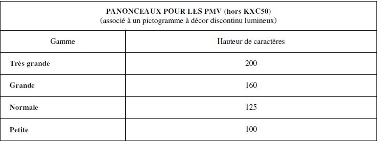 La hauteur de caractères du panonceau associé au pictogramme d'un panneau à message variable reste inférieure à la hauteur des caractères affichés par le signal-texte XC50. La disposition du signal-texte XC50 et du panonceau est représentée en annexe de la 9ème partie de la présente instruction.