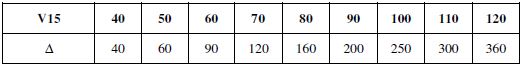 En fonction des valeurs de V15, les valeurs de Δ sont définies dans le tableau ci-dessous :