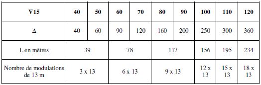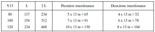 La longueur de cette ligne, appelée distance de présignalisation L, doit être adaptée aux différentes vitesses de référence, donc aux Δ comme indiqué dans le tableau ci-dessous :