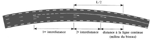 Dans le cas d'une autoroute, pour augmenter la facilité d'insertion, la longueur du biseau de rabattement est portée à 2 L (article 115-4). On adopte alors la configuration suivante pour obtenir une meilleure répartition des flèches :