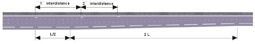 Dans le cas d'un rétrécissement de chaussée ou d'une réduction du nombre de voies, la première flèche est implantée à une distance L/2 en amont du point de référence constitué par le début de la ligne oblique de raccordement.