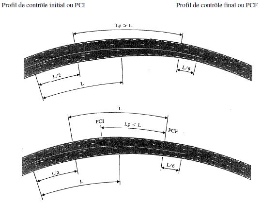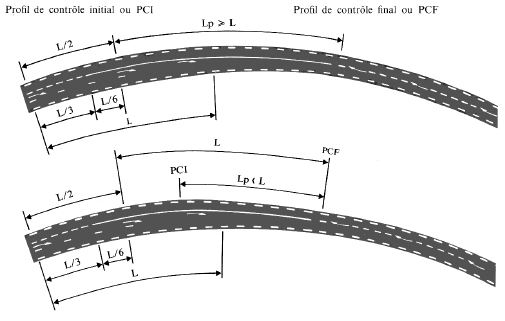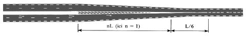 Les schémas ci-après représentent le rétrécissement de routes de 3 à 2 voies suivant que le rétrécissement physique est de longueur supérieure ou inférieure à la ligne oblique nécessaire (de longueur L).
