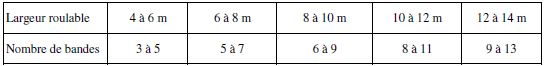 Le tableau ci-dessous indique le nombre de bandes que doit comporter un passage pour piétons en fonction de la largeur roulable de la chaussée.