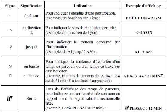 La partie pictogramme ne peut afficher que les signaux définis par l’arrêté du 24 novembre 1967 modifié relatif à la signalisation des routes et autoroutes.