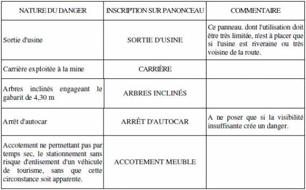 Le panneau A14 doit, autant que possible, être complété par un panonceau d'indications diverses M9 précisant la nature du danger. L’utilisation du panneau A14, pour signaler une montée dangereuse, est traitée à l’article 40-2.