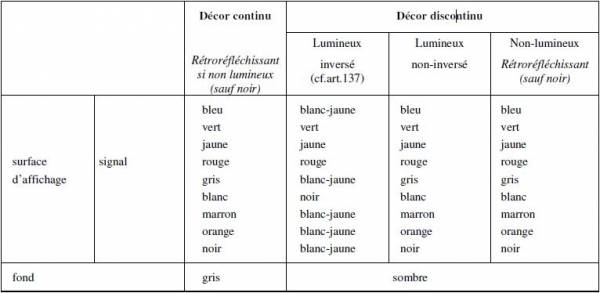 1) En signalisation permanente et en signalisation temporaire, les couleurs utilisées sont : le noir, le bleu, le vert, le jaune, le jaune vif utilisé uniquement pour le panneau B1j, le rouge, le gris, le blanc, le marron, le cyan et l'orange. Font exception les panneaux d’information locale de type Dc (cf. art. 94-1) et ceux de la signalisation piétonne (cf. art. 95-1) dont la couleur de fond doit être différente de celle utilisée pour la signalisation de direction.