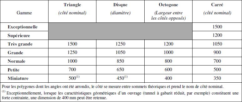 Les autres panneaux ont soit les mêmes dimensions que les signaux, soit les dimensions définies ci-dessus.