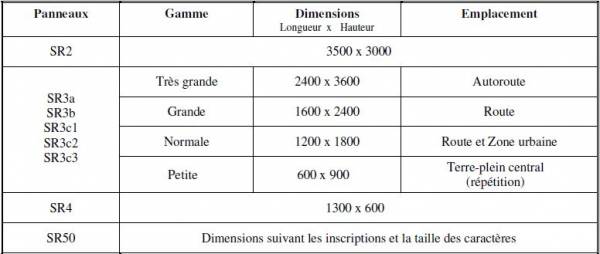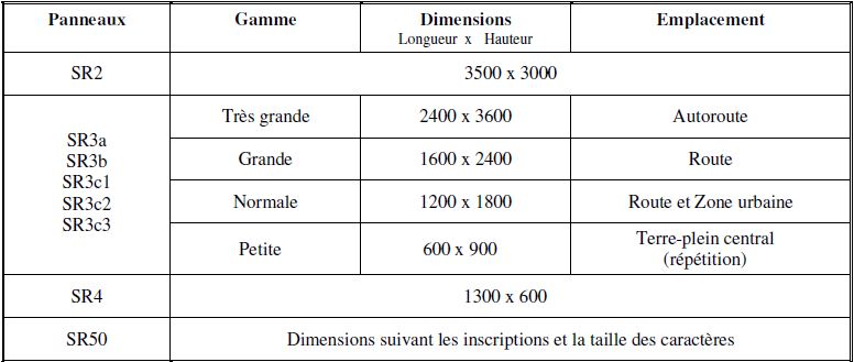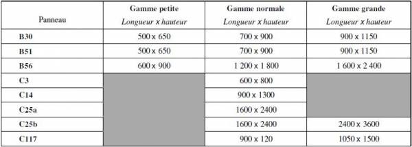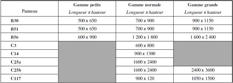 Les panneaux B30, B51, B56, C3, C14, C25a, C25b et C117 ont des dimensions spécifiques définies dans le tableau ci-après: