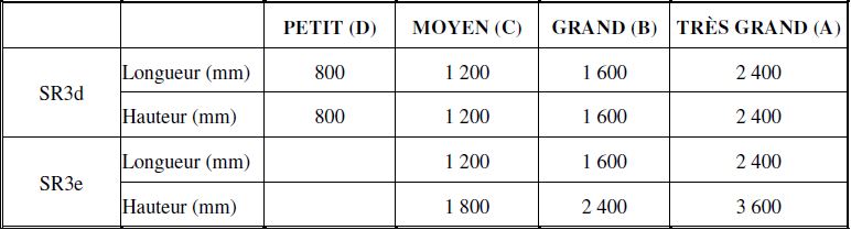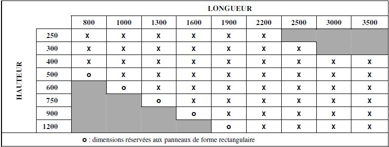 1) Pour les panneaux de type A, AB, B, C, CE, il existe sept gammes de dimensions définies dans le tableau ci-dessous :
