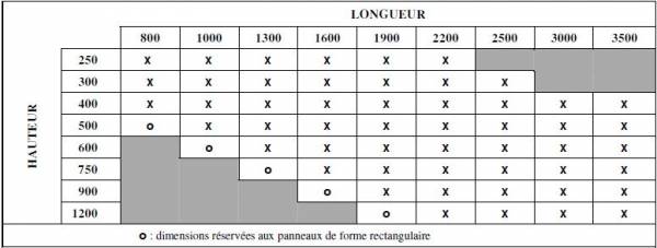 Les dimensions des panneaux D29 sont choisies parmi celles données dans le tableau ci-dessous :