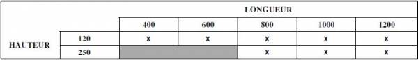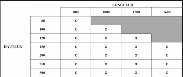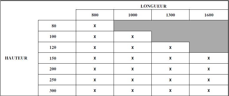 Pour les longueurs supérieures à 3500 mm et pour les hauteurs supérieures à 1200 mm, les dimensions augmentent avec un pas de 100 mm.