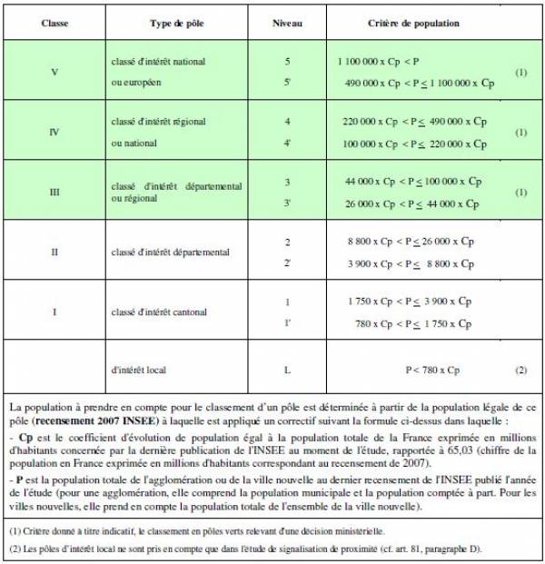 La notion de classe d'un pôle est liée à l’attractivité de ce pôle, représentée à l'aide d'indicateurs adaptés. Pour les agglomérations, le critère de classement est la population. Les seuils sont découpés en classe et chaque classe en niveau.