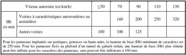 A chaque vitesse correspond une gamme de dimensionnement, appelé hauteur de base (Hb) de caractères qui permet de déterminer, selon la couleur du panneau, la hauteur de composition (Hc) nécessaire au dimensionnement des éléments constitutifs d’un panneau.