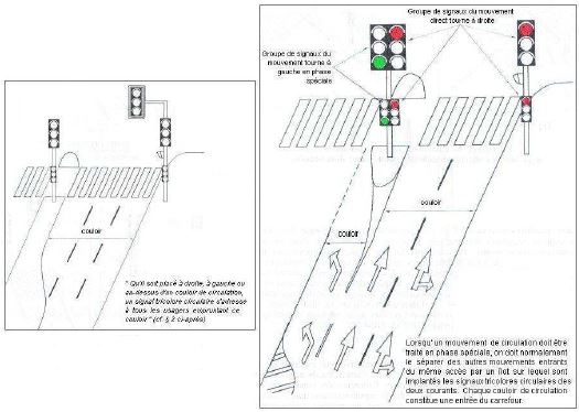 1) Les signaux tricolores circulaires R11 doivent être employés chaque fois qu’un couloir de circulation est constitué d’une seule entrée dans une intersection, c’est à dire que tous les mouvements directionnels qui l’empruntent sont admis simultanément dans la même phase de circulation.