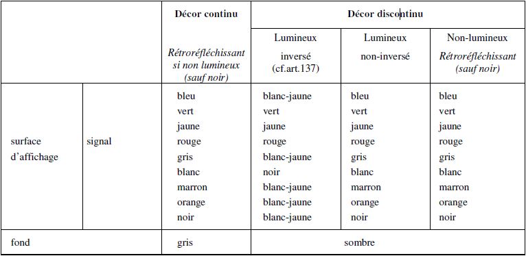 2) En signalisation dynamique : Les couleurs de la surface d'affichage du signal dépendent de la technologie d’affichage. Elles sont données dans le tableau ci-après :