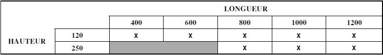 1) Pour les panneaux de type A, AB, B, C, CE, il existe sept gammes de dimensions définies dans le tableau ci-dessous :