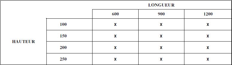 Pour les longueurs supérieures à 3500 mm et pour les hauteurs supérieures à 1200 mm, les dimensions augmentent avec un pas de 100 mm.