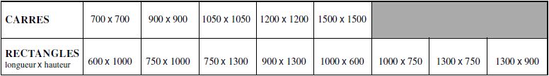 Dans les tableaux ci-après, toutes les dimensions des panneaux sont exprimées en millimètres.