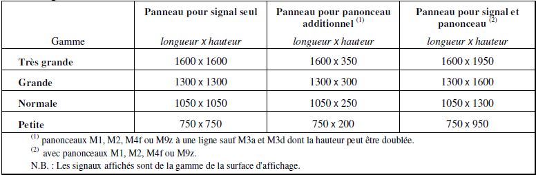 Les autres panneaux ont soit les mêmes dimensions que les signaux, soit les dimensions définies ci-dessus.