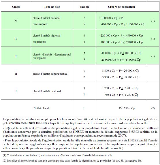 La notion de classe d'un pôle est liée à l’attractivité de ce pôle, représentée à l'aide d'indicateurs adaptés. Pour les agglomérations, le critère de classement est la population. Les seuils sont découpés en classe et chaque classe en niveau.